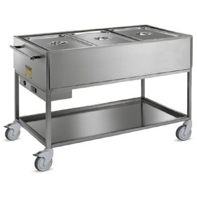 Carrelli termici per distribuzione pasti (GN escluse).Struttura completamente in acciaio inox AISI 304,18/10.Vasca a doppia parete.Riscaldato mediante resistenza elettrica a bagnomaria 2000 W - 230 V.Controllo temperatura tramite termostato digitale 30° - 90° C°.Cavo elettrico spiralato con spina Schuko.4 ruote piroettanti in gomma grigia,2 con freno Ø 125 mm.Carrello termico capacità 4 GN 1/1 h 200 (60-80 pasti) mm 1500x640x900 h