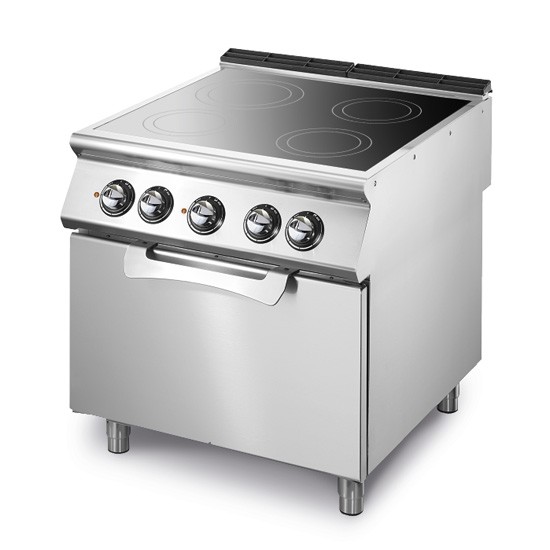 Cucina elettrica 4 piastre con forno elettrico statico. Fianchi, fondo e schienale in acciaio inox. Piano in vetroceramica, sigillato ermeticamente al piano, dotato di quattro zone di cottura indipendenti con elementi radiandi di diametro 300 mm e di potenza 3,4 kW ciascuno regolata da regolatore di energia. Predisposizione per l'unione di testa. Le zone di cottura sono delimitate da contorni serigrafati sul vetro. Lampade spia per segnalare il corretto funzionamento dell'apparecchiatura. Forno elettrico GN 2/1. Riscaldamento tramite resistenze superiori ed inferiori a regolazione indipendente. Regolazione della temperatura, tramite termostato, da 50°C a 300°C. Termostato di sicurezza. Lampada spia per indicare corretto funzionamento del forno. Camera di cottura in acciaio inox. Controporta forno in acciao inox con tenuta a labirinto. Potenza forno 6 kW. Manopole di comando a labirinto che impediscono penetrazione di acqua all'interno durante le operazioni di pulizia. Grado di protezione IPX5. Apparecchiatura dotata di piedini regolabili in altezza in acciaio inox. Alimentazione elettrica VAC 400 3N 50÷60 Hz - 19,6 kW.