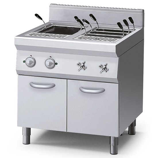 Cuocipasta gas 2 vasche capacità 40+40 litri. Fianchi, fondo e schienale in acciaio inox. Piano in acciaio inox AISI 304 spessore 20/10 stampato con invaso antitraboccamento. Camino posteriore in ghisa smaltata; predisposizione per l'unione di testa. Vasche stampate in acciaio inox AISI 316 lucido con fondo raggiato. Carico acqua tramite rubinetto posto sul cruscotto frontale. Erogatore d'acqua fisso, in acciaio inox, collocato sotto il piano di sgocciolamento. Il riscaldamento avviene tramite bruciatori in acciaio inox a fiamma stabilizzata con bruciatore pilota e termocoppia di sicurezza. Accensione automatica tramite dispositivo piezoelettrico. Il riscaldamento è regolabile tramite rubinetto di sicurezza con termocoppia. Scarico acqua tramite rubinetto situato all'interno della base sottostante. Manopole di comando a labirinto che impediscono penetrazione di acqua all'interno durante le operazioni di pulizia. Apparecchiatura dotata di piedini regolabili in altezza in acciaio inox. Cestelli esclusi. Grado di protezione IPX5. Totale potenza gas 23,6 kW.