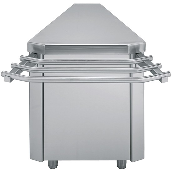 Elemento angolo esterno 45°. Piano di lavoro in acciaio inox AISI 304 18/10, spessore 15/10 satinato Scotch brite. Altezza 70 mm, rinforzato e con bordo frontale arrotondato R 10 mm. Struttura portante con fianchi, schienali, ripiano intermedio regolabile e ripiano inferiore posizionato a 150 mm da terra, realizzata in acciaio inox AISI 304 satinato Scotch Brite. Dotato di piedini di livellamento regolabili in acciaio inox/nylon. Totale assenza di spigoli vivi.