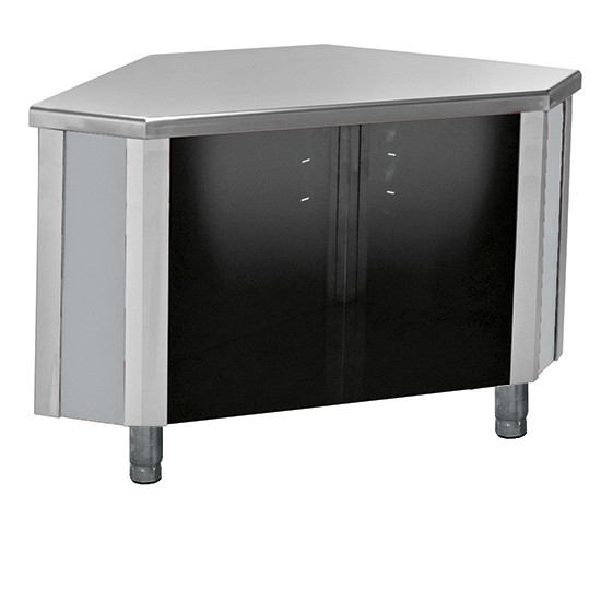 Elemento angolo esterno 90°. Piano di lavoro in acciaio inox AISI 304 18/10, spessore 15/10 satinato Scotch brite. Altezza 70 mm, rinforzato e con bordo frontale arrotondato R 10 mm. Struttura portante con fianchi, schienali, ripiano intermedio regolabile e ripiano inferiore posizionato a 150 mm da terra, realizzata in acciaio inox AISI 304 satinato Scotch Brite. Dotato di piedini di livellamento regolabili in acciaio inox/nylon. Totale assenza di spigoli vivi.