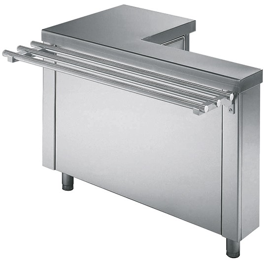 Elemento cassa protezione destra. Piano di lavoro in acciaio inox AISI 304 spessore 15/10, satinato Scotch Brite. Altezza 80 mm rinforzato e con bordo frontale arrotondato R 10 mm. Struttura portante con fianchi, schienali, cassetto cassa con serratura e ripiano inferiore posizionato a 150 mm da terra, realizzata in acciaio inox AISI 304 satinato Scotch Brite. Dotato di piedini di livellamento regolabili in acciaio inox/nylon. Collegamento elettrico a presa schuko per alimentazione cassa. Totale assenza di spigoli vivi.