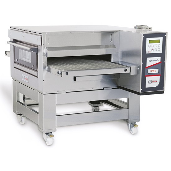 Forno a tunnel: La versatilità dei forni Synthesis V consente di cucinare una vasta quantità di prodotti diversi. Ad esempio: al mattino possono essere cotti prodotti da pasticceria per le colazioni; all'ora di pranzo pasticcio di lasagne e cosce di pollo; al pomeriggio si possono grigliare melanzane e peperoni; ...e la sera si possono cuocere le pizze! I vantaggi dell'utilizzo di un forno a tunnel Synthesis V sono essenzialmente vantaggi di ordine ergonomico: a) con un semplice movimento si depone il prodotto da cuocere direttamente sulla rete di trascinamento, senza dover aprire e chiudere porte ed utilizzare pale o altri attrezzi per infornare; b) si ha il beneficio di sfruttare la rete di trascinamento come nastro trasportatore per far confluire i prodotti direttamente nella zona di utilizzo; c) con Synthesis V non serve seguire la cottura, poichè il tempo e la temperatura sono impostati preventivamente (questo fattore consente di ottimizzare il ciclo produttivo, in quanto, nel ciclo normale di produzione della pizza, si ha una persona che spiana e farcisce il prodotto, una seconda che inforna e segue la cottura e una terza che confeziona o distribuisce il prodotto). Così, con un notevole vantaggio economico, occorrono solo due persone per l'utilizzo di un forno a tunnel Synthesis V! La tecnologia impiegata nei forni a tunnel Synthesis V ha portato a sfruttare al meglio i flussi d'aria che investono i cibi. Contrariamente ai normali forni a convezione in cui i flussi investono i cibi in una sola direzione, con Synthesis V i cibi vengono lambiti contemporaneamente dall'alto verso il basso e dal basso verso l'alto da piccoli getti d'aria calda. Con tale sistema, questi getti d'aria calda avvolgono interamente il prodotto, mentre lo stesso si muove nella camera di cottura su di una rete a velocità costante (in modo da ottenere il tempo di cottura necessario). I prodotti sono sempre cotti perfettamente e con omogeneità costante nel tempo. Il sistema consente di esaltare il sapore e mantenere la fragranza più a lungo, garantendo una qualità stabile del prodotto.