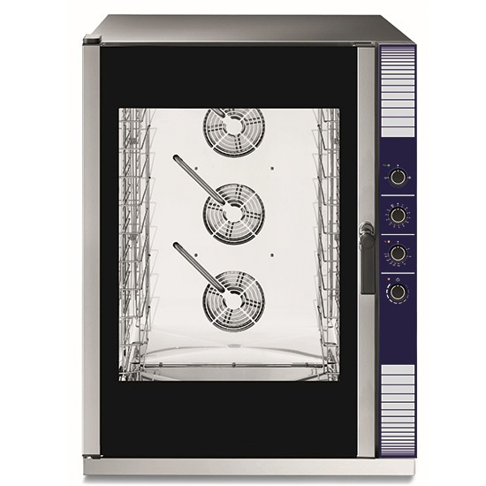 Forni convezione vapore diretto Tipo di cottura: aria ventilata 300°C, vapore diretto 100°C, mix ariaventilata/vapore 250°C, vapore bassa temperatura 30-99°C (regenerazione alimenti). Costruito in acciaio inox . Isolazione termica in fibra ceramica, cella di cottura interamente saldata a tenuta stagna totale, angoli e spigoli arrotondati, guarnizione ermetica posta sulla parte anteriore della cella di cottura, fondo inbutito che raccoglie le condensazioni verso lo scarico. Struttura porta teglie facilmente amovibile, diffusore di calore facilmente smontabile. Illuminazione laterale permette una visione globale della cella, la concezione unica della cella accoppiata ad un ventilatore in acciaio inox , posizionato sul fondo garantisce una diffusione omogenea del calore. maniglia porta ergonomica e atermica, chiusura automatica, vetro interno porta montato su cerniere facilita lo smontaggio e la pulizia, micro interruttore di arresto in caso di apertura porta. Generatore di vapore lella cella di cottura di tipo istantanea, grazie ad un nebulizzatore vapore diretto, con controllo automatico della quantità di vapore necessaria, accoppiata al termostato elettronico assicura una cottura omogenea ed economica (brevetto esclusivo).Condensatore di vapore di serie, riduce la temperatura dei condensati e l'avacuazione, limitando la fuoriuscita dei vapori all'apertura della porta.Camera di cottura: composto di selettore di cottura, termostato da 50 a 300°C, timer da 1 a 120 min. controllo della sonda a cuore,raffreddamento rapido della cella di cottura,ciclo di pulizia semiautomatico, 1 velocità. Attrezzatura costruita nel rispetto di tutte le normative CE in vigore.Accessori inclusi: struttura guide, passo 60 mm.
