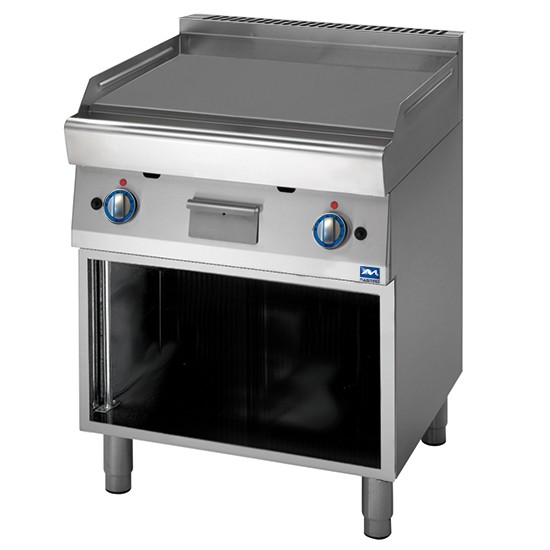 Piano di lavoro in acciaio inox AISI 304, spessore 10/10. Saldatura ermetica delle piastre al piano per evitare interstizi. Piastra realizzate con superficie satinata. Piastre inclinate di 10 mm per facilitare la raccolta dei grassi. Capacità del cassetto raccolta grassi di 1,5 litri. Accensione del bruciatore pilota con accenditore piezoelettrico. Regolazione riscaldamento mediante rubinetto di sicurezza con termocoppia o valvola di sicurezza. Modello senza termostato di sicurezza.