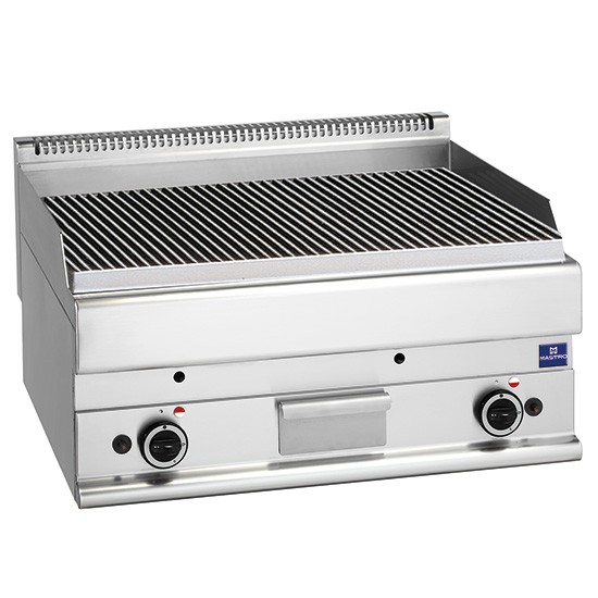 Griglia a gas. Piano in acciaio inox AISI 304 spessore 8/10; involucro in acciaio inox AISI 430 spessore 8/10; fondi e parti interne in acciaio AISI 430; rinforzi interni eseguiti in materiale anticorrosione (lamiera alluminata). Griglia con piano di cottura in ghisa, dotata di 2 zone di cottura indipendenti. Bruciatori in acciaio inox (nr. 2x7,5 kW). Rubinetti gas valvolati in sicurezza con termocoppia e bruciatori pilota per l'accensione automatica dei bruciatori. Accensione piezoelettrica dei bruciatori. Bacinella raccogligrassi in acciaio inox. Potenza totale 15 kW.