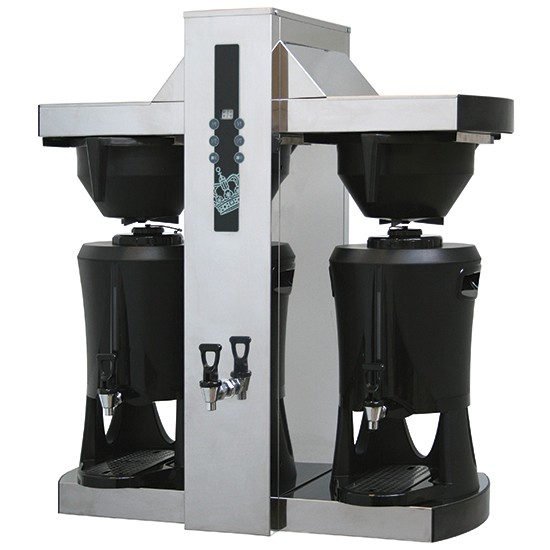 Macchina di caffè a filtro con a?c?qua boiler per a?c?qua calda? ?e ?con Contenitore Termico che permette di mantenere a temperatura le bevande, con pareti coibentate, funzionano come normali thermos.E' necessario quindi versare la bevanda già calda o fredda, questa viene mantenuta a temperatura con una variazione di soli 4/5° l'ora.?9 ? ?kw 400 volt, capacità boiler 5 lt, capacità t?hermos ?5?+?5? lt .Semplici e pratici, sono indispensabili per la distribuzione delle bevande, predisposto per attacco idrico diretto?.?