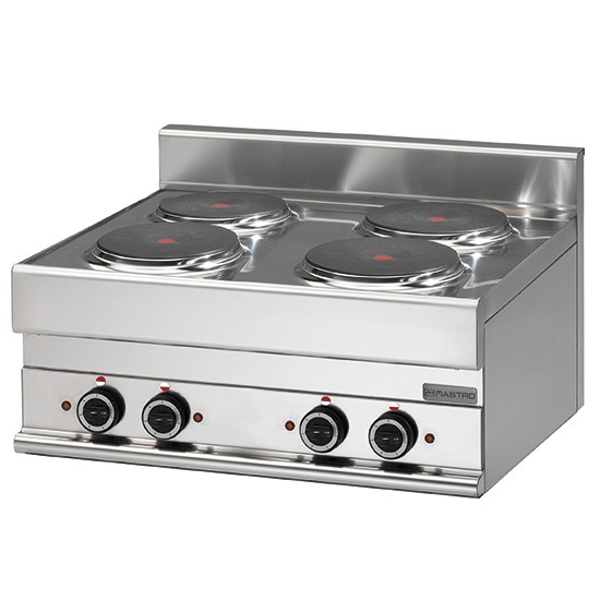 Piano di cottura elettrico 4 piastre. Piano in acciaio inox AISI 304 spessore 8/10; involucro in acciaio inox AISI 430 spessore 8/10; fondi e parti interne in acciaio AISI 430; rinforzi interni eseguiti in materiale anticorrosione (lamiera alluminata). Piano di cottura elettrico dotato di 4 piastre in ghisa Ø 22 cm. con bordo in acciaio inox a tenuta sul piano. Nr. 4 resistenze x 2,6 kW/cad. 6 possibilità di regolazione della temperatura per ogni piastra. Lampade spia di segnalazione inserimento alimentazione elettrica e funzionamento piastre. Potenza totale 10,4 kW. Tensione di alimentazione V AC 400+3N 50÷60 Hz.