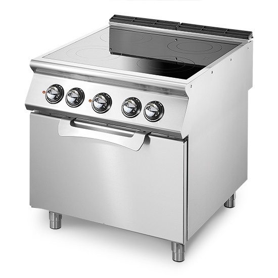 Cucina elettrica 4 piastre con forno elettrico statico. Fianchi, fondo e schienale in acciaio inox. Piano in vetroceramica, sigillato ermeticamente al piano, dotato di quattro zone di cottura indipendenti con elementi radiandi di diametro 230 mm e di potenza 2,5 kW ciascuno regolata da regolatore di energia. Predisposizione per l'unione di testa. Le zone di cottura sono delimitate da contorni serigrafati sul vetro. Lampade spia per segnalare il corretto funzionamento dell'apparecchiatura. Forno elettrico GN 2/1. Riscaldamento tramite resistenze superiori ed inferiori a regolazione indipendente. Regolazione della temperatura, tramite termostato, da 50°C a 300°C. Termostato di sicurezza. Lampada spia per indicare corretto funzionamento del forno. Camera di cottura in acciaio inox. Controporta forno in acciao inox con tenuta a labirinto. Potenza forno 6 kW. Manopole di comando a labirinto che impediscono penetrazione di acqua all'interno durante le operazioni di pulizia. Apparecchiatura dotata di piedini regolabili in altezza in acciaio inox. Grado di protezione IPX4. Alimentazione elettrica VAC 400 3N 50/60 Hz, 16 kW.