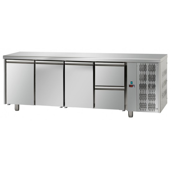 TAVOLO REFRIGERATO 4 PORTE con ALZATINA, capacità lt.620, temperatura d'esercizio 0°/+10°C, Marca TECNODOM:struttura interna ed esterna in Acciaio Inossidabile, con esclusione del fondo esterno in Acciaio Galvanizzato;angoli interni arrotondati;vani adatti all'inserimento di griglie o teglie Gastro-Norm 1/1 (mm 530x325);capacità lt.620;temperatura d'esercizio 0°/+10°C;isolamento in poliuretano senza CFC, iniettato ad alta pressione;spessore dell’isolamento: 40 mm;porte con chiusura automatica e guarnizione magnetica;pannello di controllo elettronico frontale con sonda NTC;refrigerazione ventilata;unità refrigerante a monoblocco estraibile e tropicalizzata di serie (temperatura ambiente +43°C ed umidità relativa del 65%);funzionante con gas R404A/R507;sbrinamento ed evaporazione dell’acqua di condensa completamente automatici;piedi in Acciaio Inossidabile regolabili in altezza (110/190 H mm). In Dotazione:1 griglia Rilsan GN 1/12 guide inox ad “L” per porta.