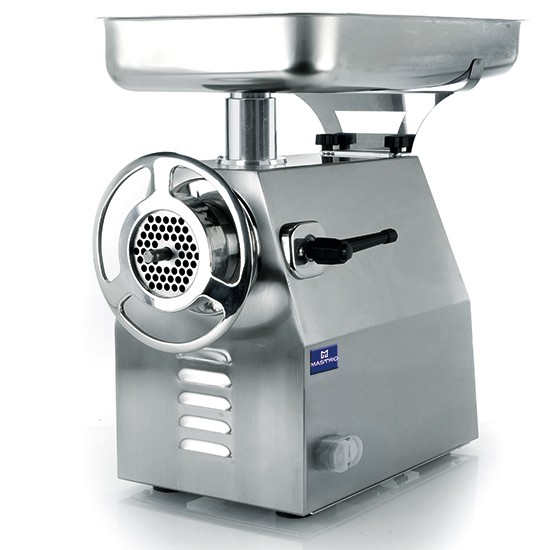 Apparecchio per uso professionale molto potente. Macellerie, supermarket, grandi comunita. Struttura in robusta lamiera di acciaio inox AISI 304. Riduttore ermetico a bagno d'olio. Motore asincrono ventilato. Termica di protezione. Bocca carne enterprise asportabile disponibile in:. Acciaio inossidabile AISI 304. Trafile auto affilanti in acciaio inox di serie. Tubo carico carne 52mm per 120 mm. Dimensioni scarico 98 mm. Tramoggia e piatto raccolta prodotto in acciaio inox. Pestello in ABS. Centralina elettronica a 24 volt. Pulsante avviamento termoplastico protetto. da membrana in lattice di gomma.